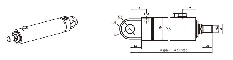 活塞桿端為內(nèi)螺紋桿頭耳環(huán)連接
